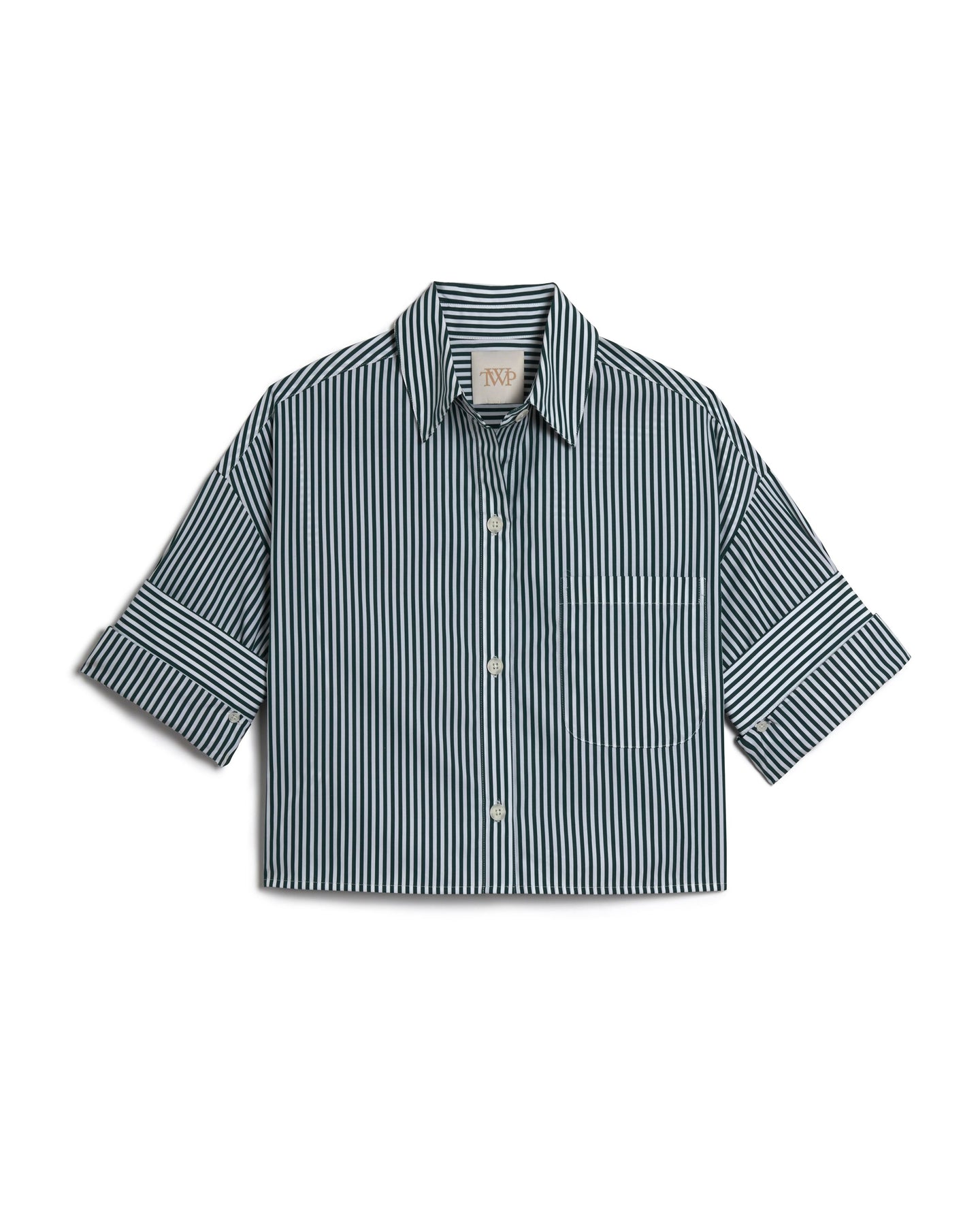 Signature short sleeved button down in bold striped cotton shirting has a soft, smooth feel to touch. The Next Ex is a cropped, boxy silhouette, complete with a chest patch pocket, button up placket, spread collar, and our signature double roll button cuffs.