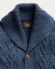 Aran-knit design made slub cotton yarn for added texture. Racking stitch details at the collar and placket. Ribbed cuffs and hem. Genuine horn buttons.